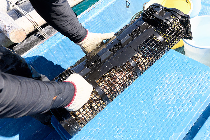 - 育成:カゴ(バスケット)(フロート式)を用い、牡蠣同士がくっつかないように一粒ずつ独立した状態で成長させます。